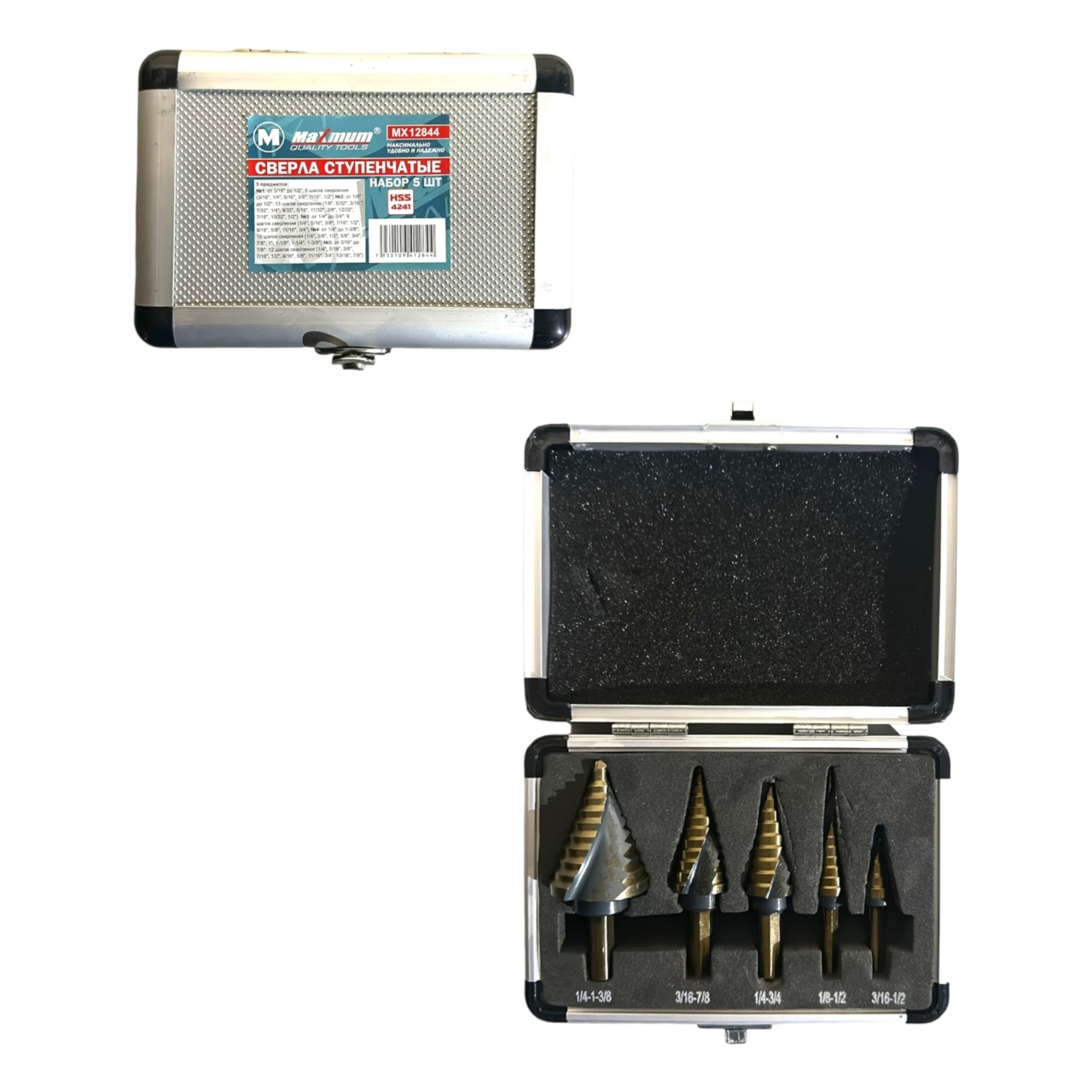 Набор ступенчатых быстрорежущих HSS сверл из стали 4241с винтовой канавкой от "MAXIMUM QUALITY TOOLS" включает в себя 5 предметов с трехгранным хвостовиком. Ступенчатое сверло с двумя спиральными канавками используется для металла, дерева и пластика. Угол заострения 118 градусов, ступенчатый угол 90 градусов.